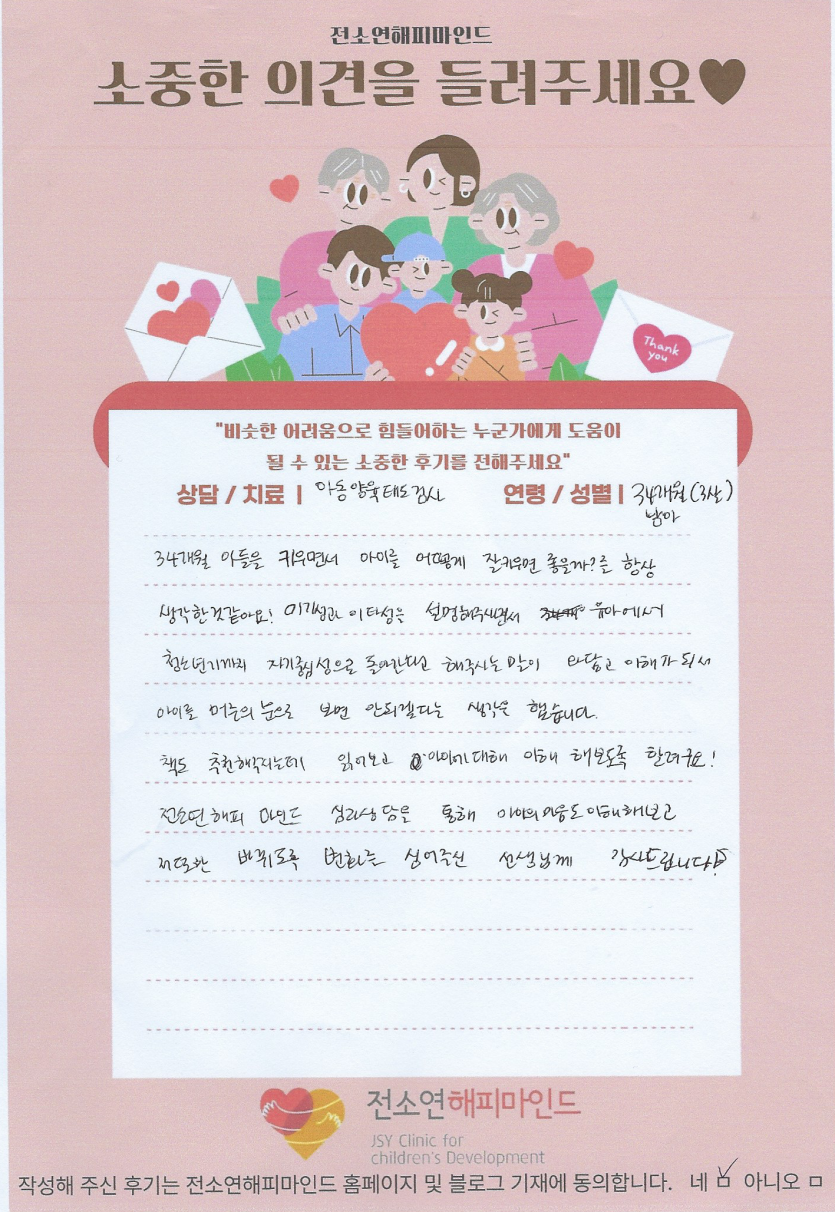 "전소연해피마인드 심리상담을 통해 아이의 마음도 이해해보고, 저 또한 바뀌도록 변화를 심어주신 선생님께 감사드려요."