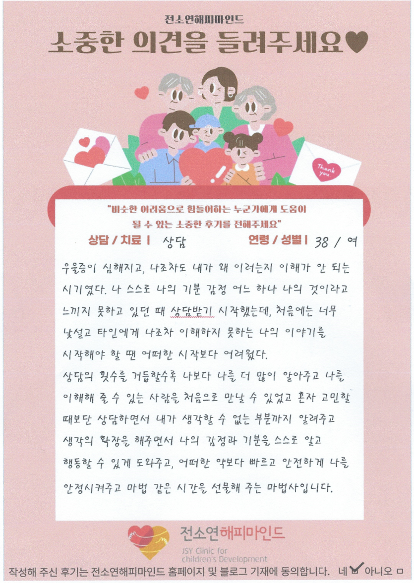 "전소연해피마인드 심리상담을 통해 아이의 마음도 이해해보고, 저 또한 바뀌도록 변화를 심어주신 선생님께 감사드려요."
